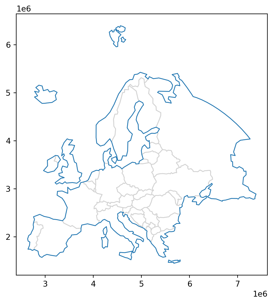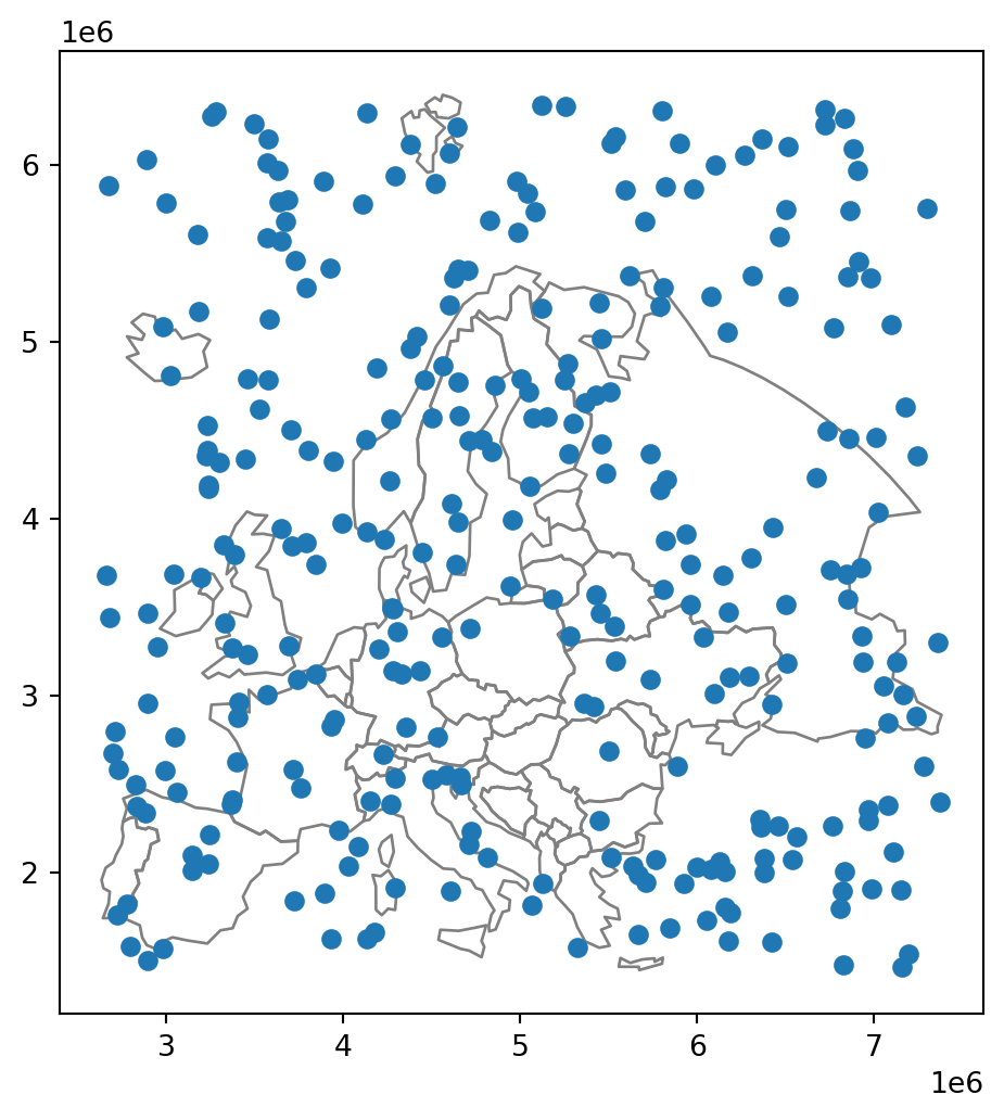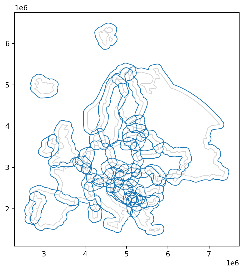 - Plot the selected country borders, together with three buffer sizes—100 \(km\), 200 \(km\), and 300 \(km\) (Figure 19.1)