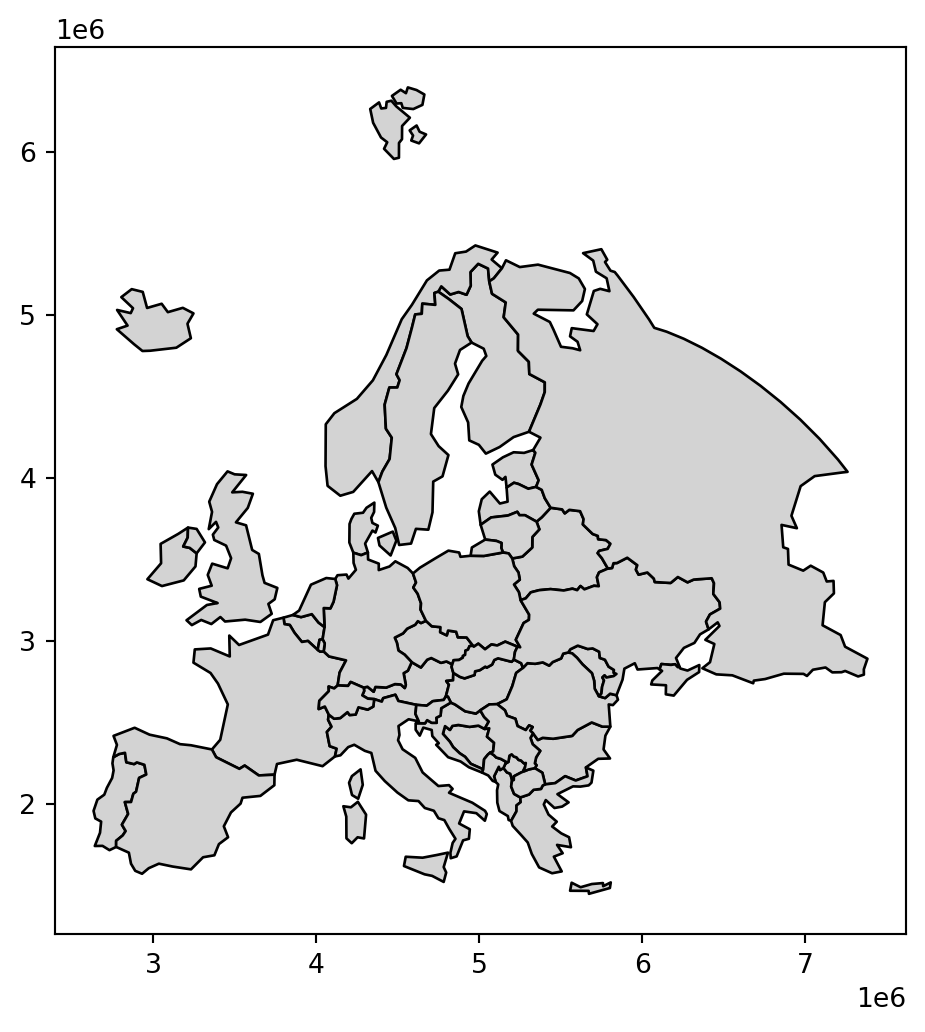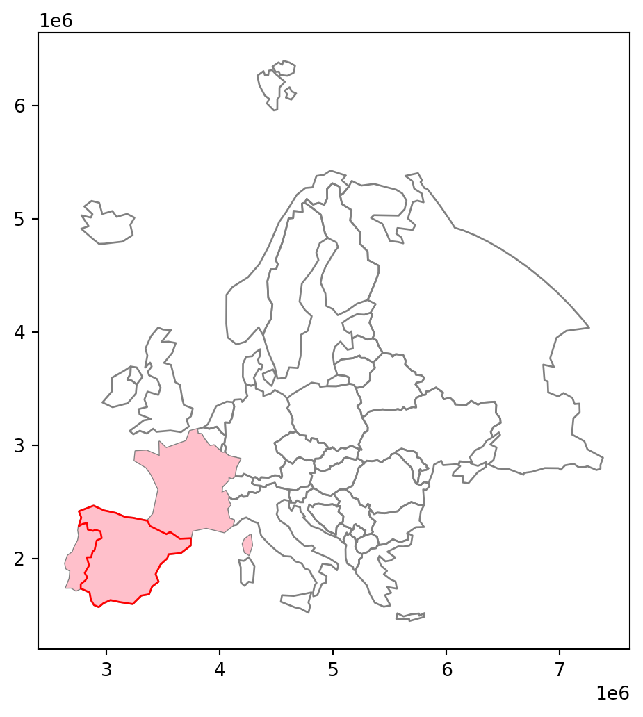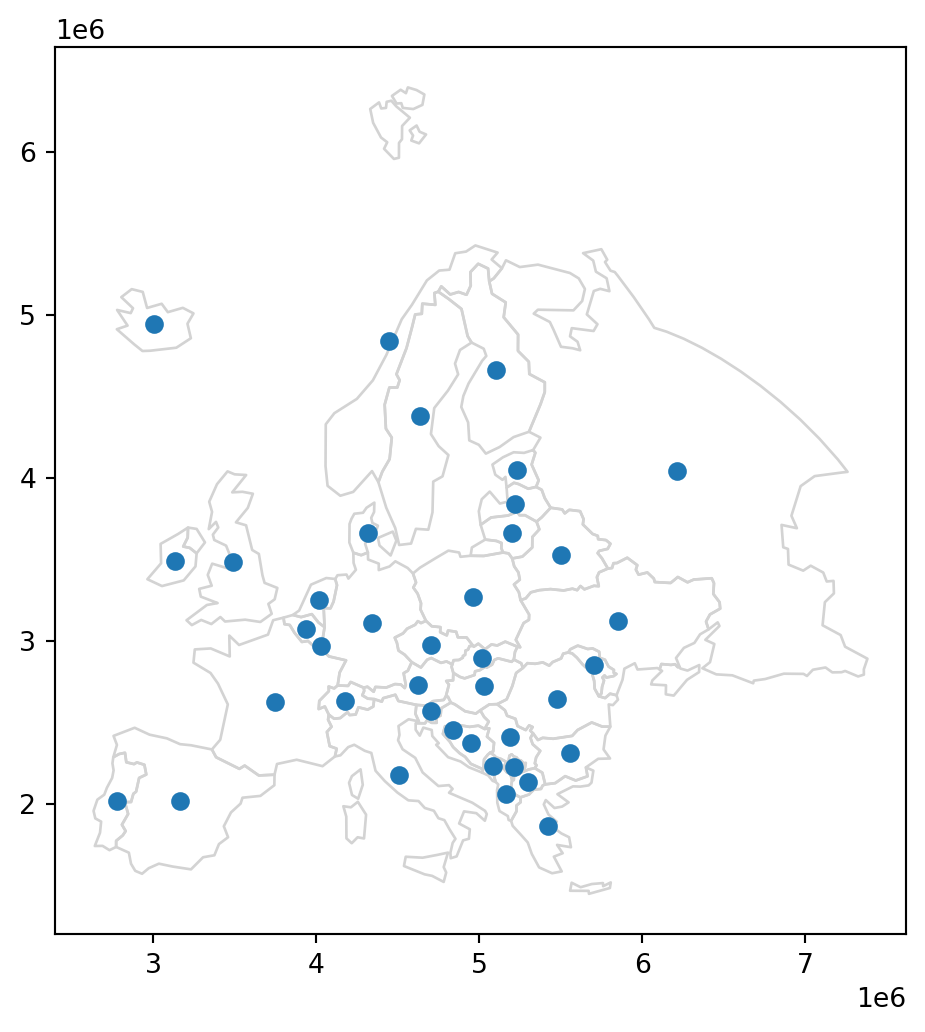 - Calculate the distances, in \(km\), from the selected country to all other European countries (excluding self)