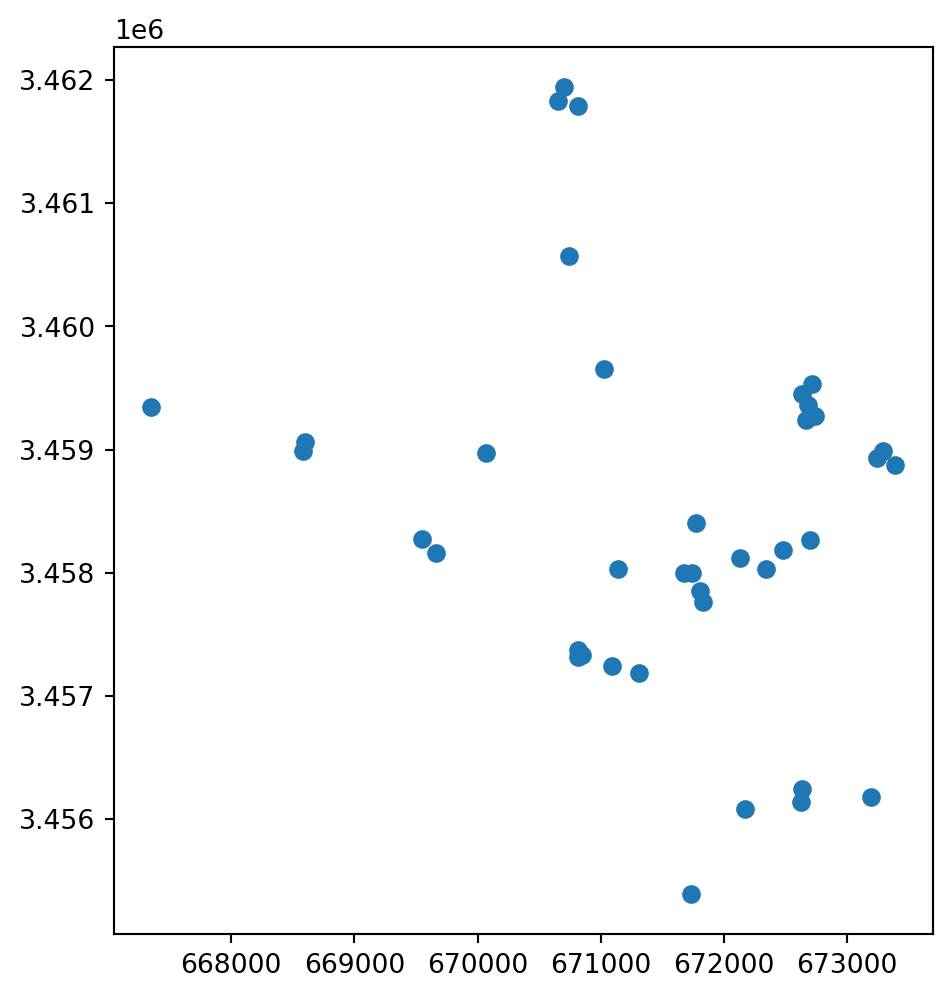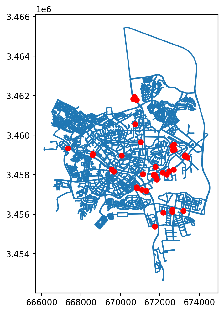 gpd.GeoSeries([shapely.Point(345000, 4025000)]).plot(color='red', ax=ax);