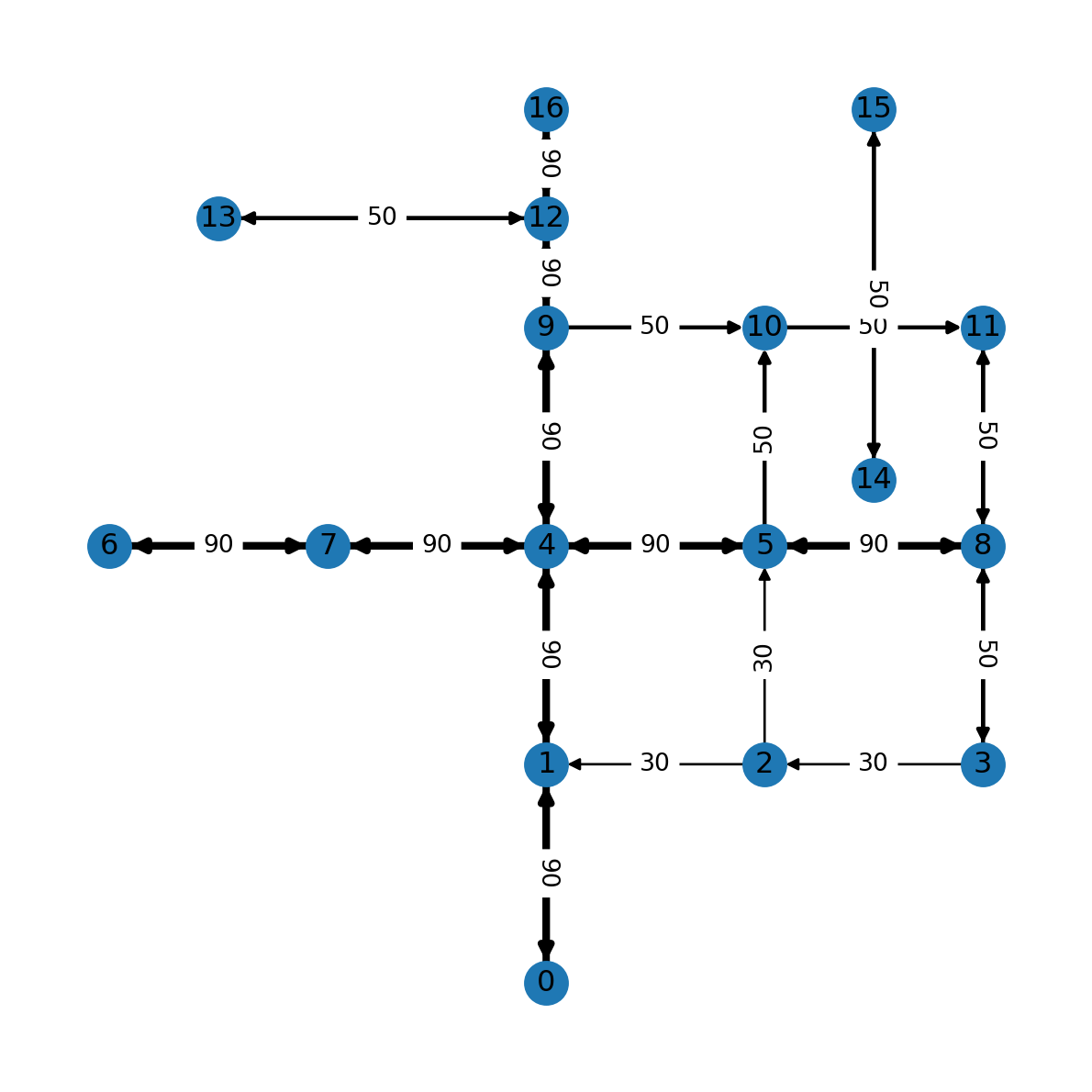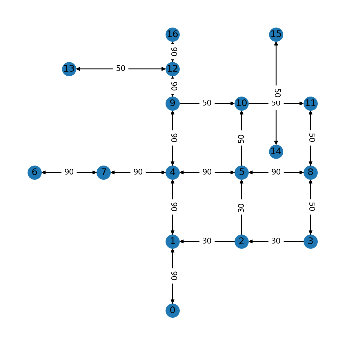 G.remove_edge(2, 3)The result is shown in Figure 7.4. Note how some of the road segments are now one way (e.g., 2→3).