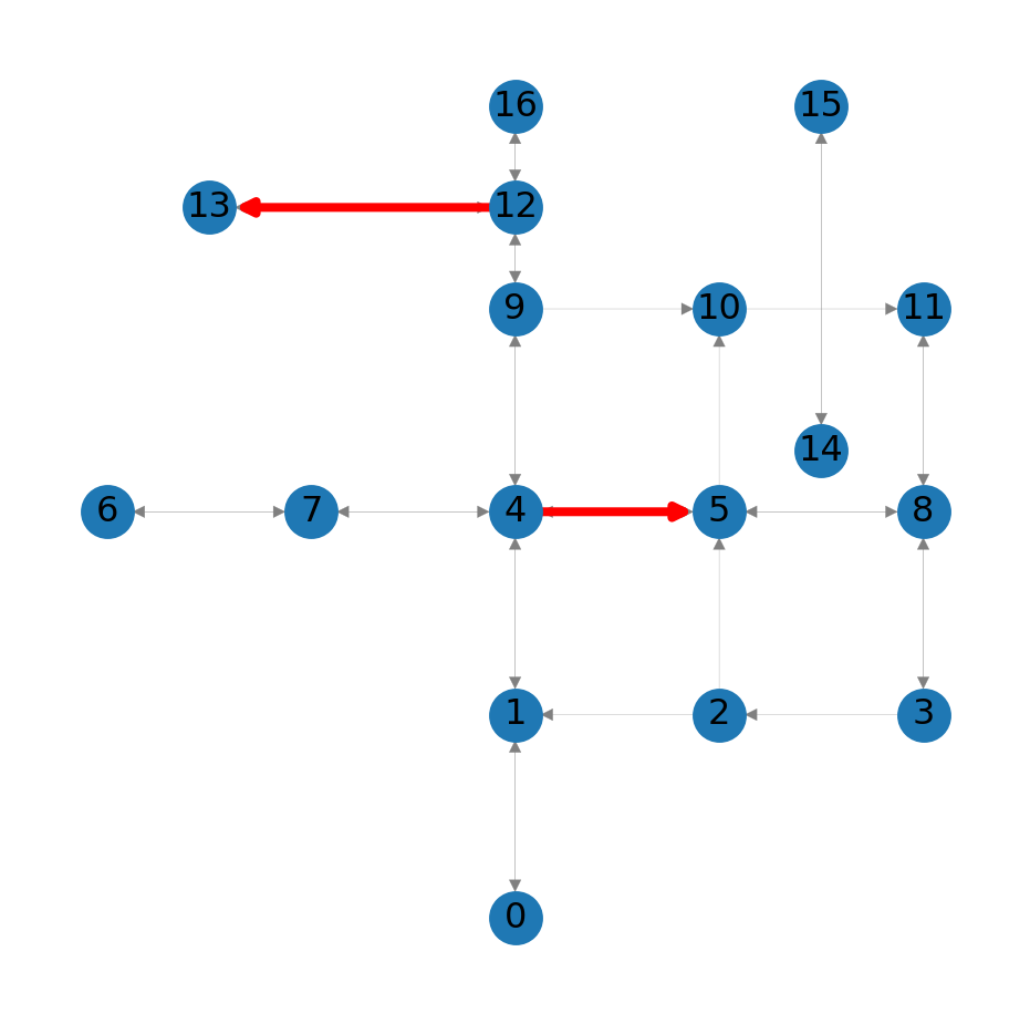 For example, in Figure 8.1 we draw two specific edges—(4,5) and (12,13)—in red color (edge_color='r') and increased line width (width=3):