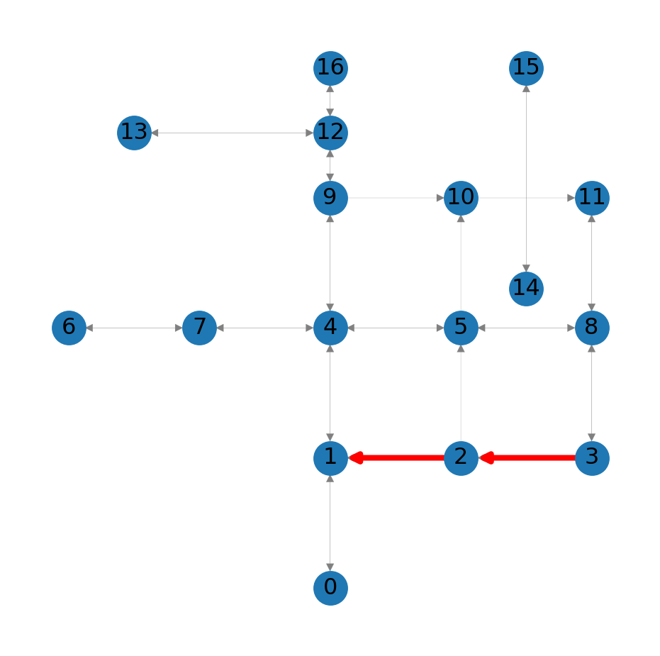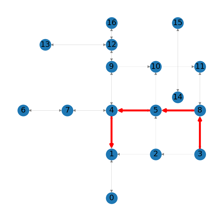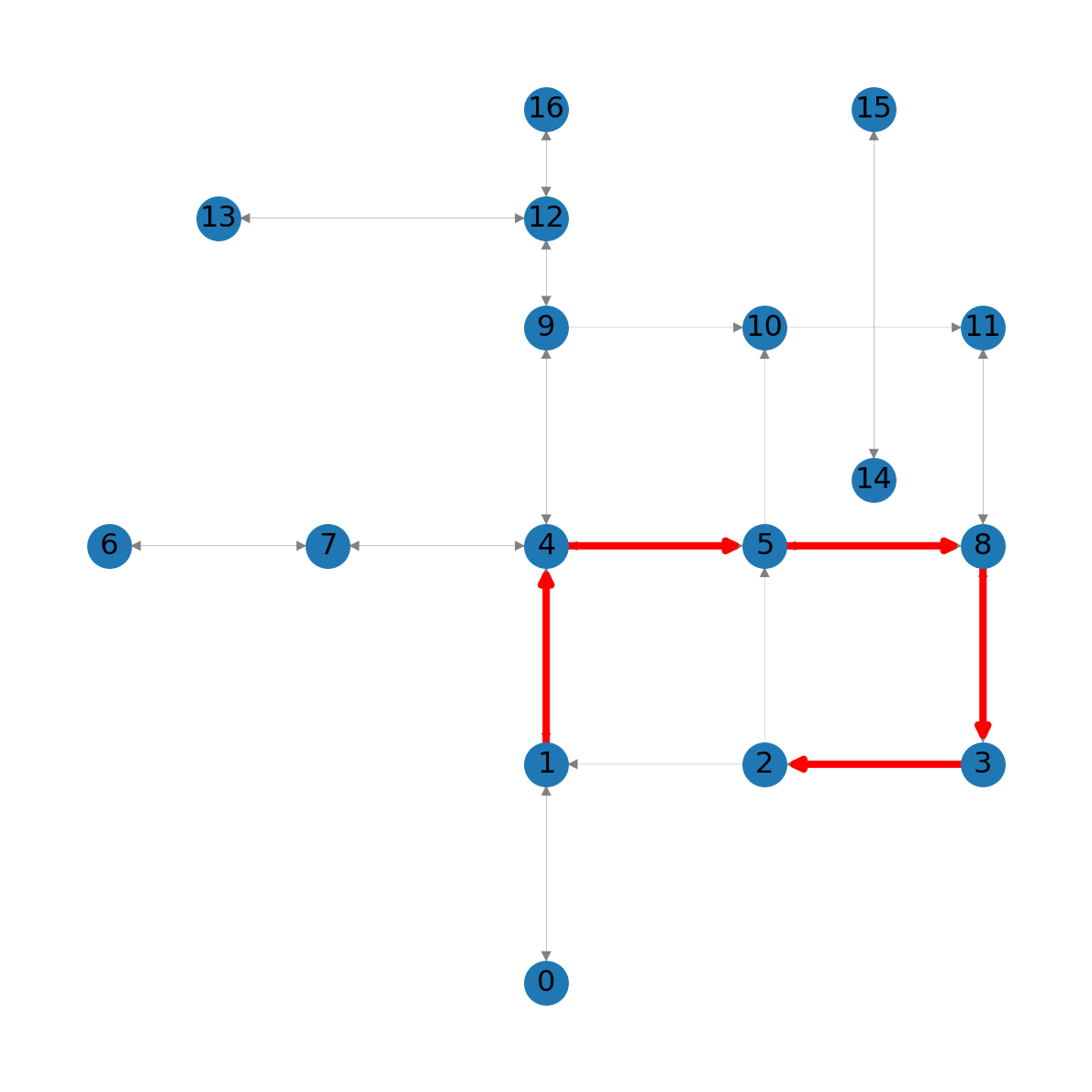 Note that routes can only follow edge directions. For example, the route from node 1 to adjacent node 2 has to go around because there is no direct 1→2 edge: