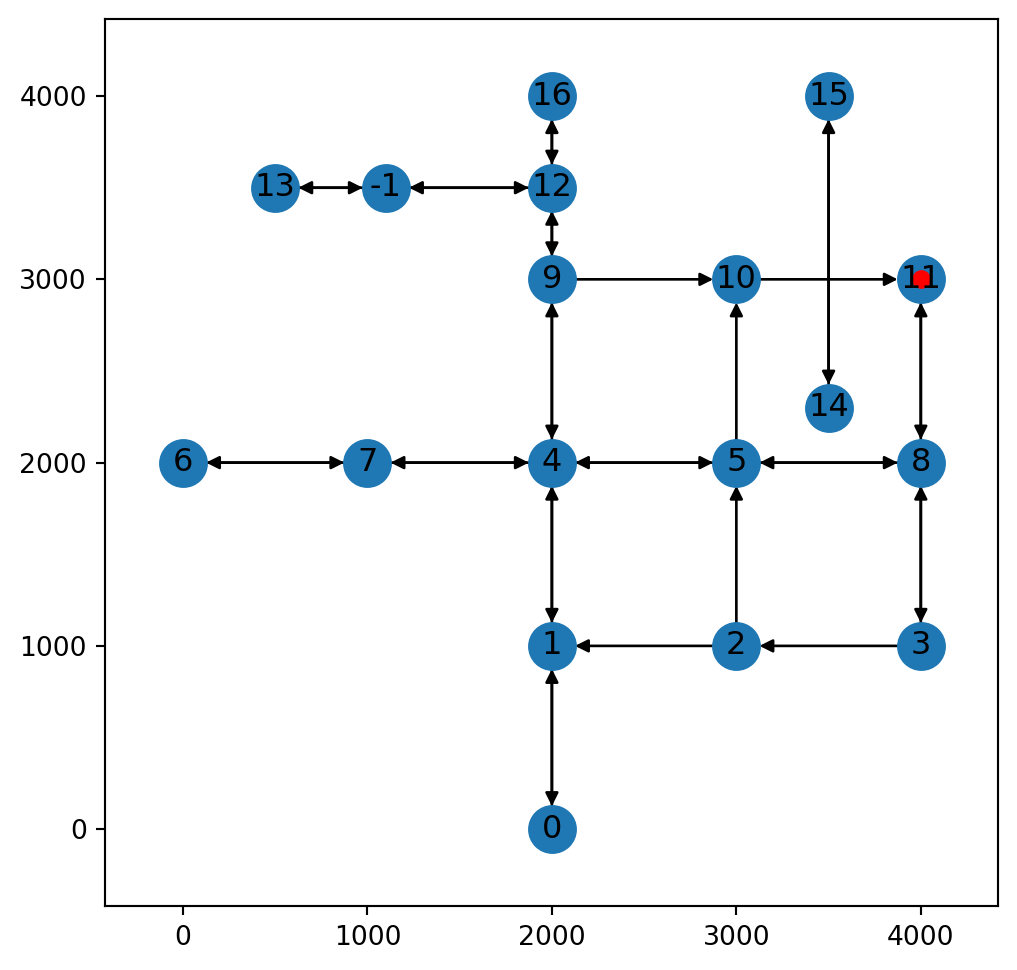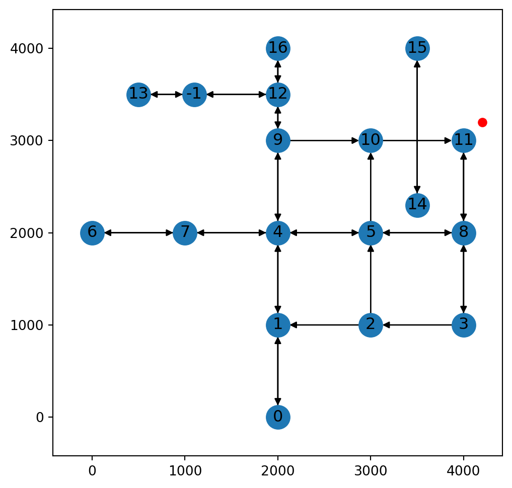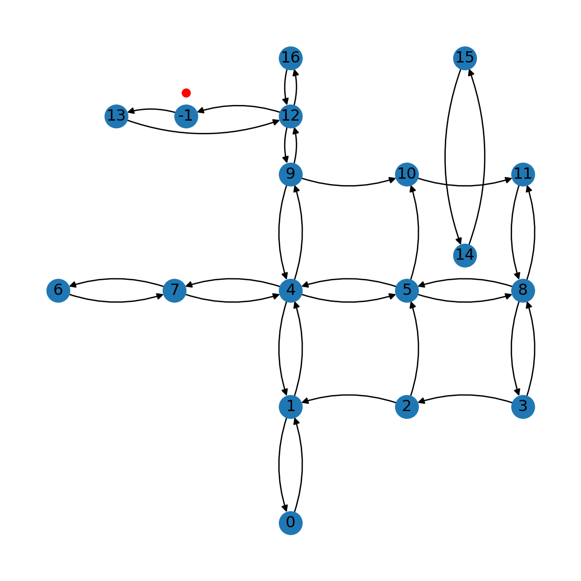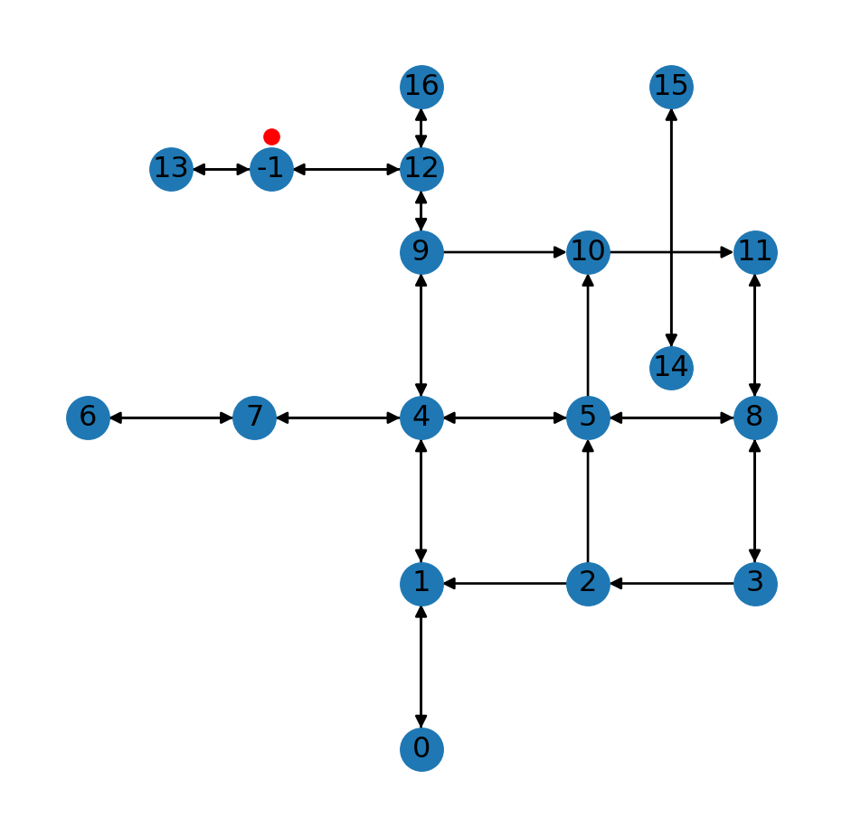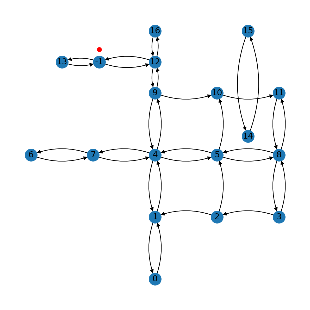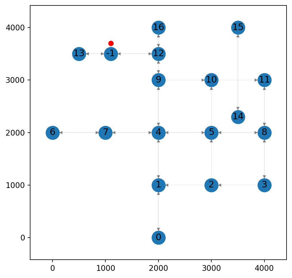 G.add_edge(-1, 12)Next, we deal with the new node and edges’ attributes. The node 'geometry' attribute is according to pnt: