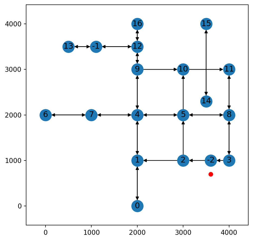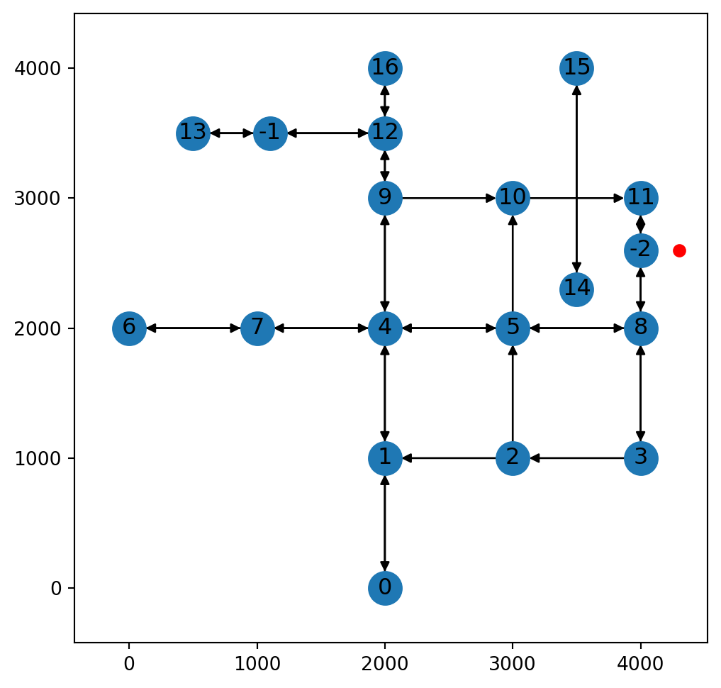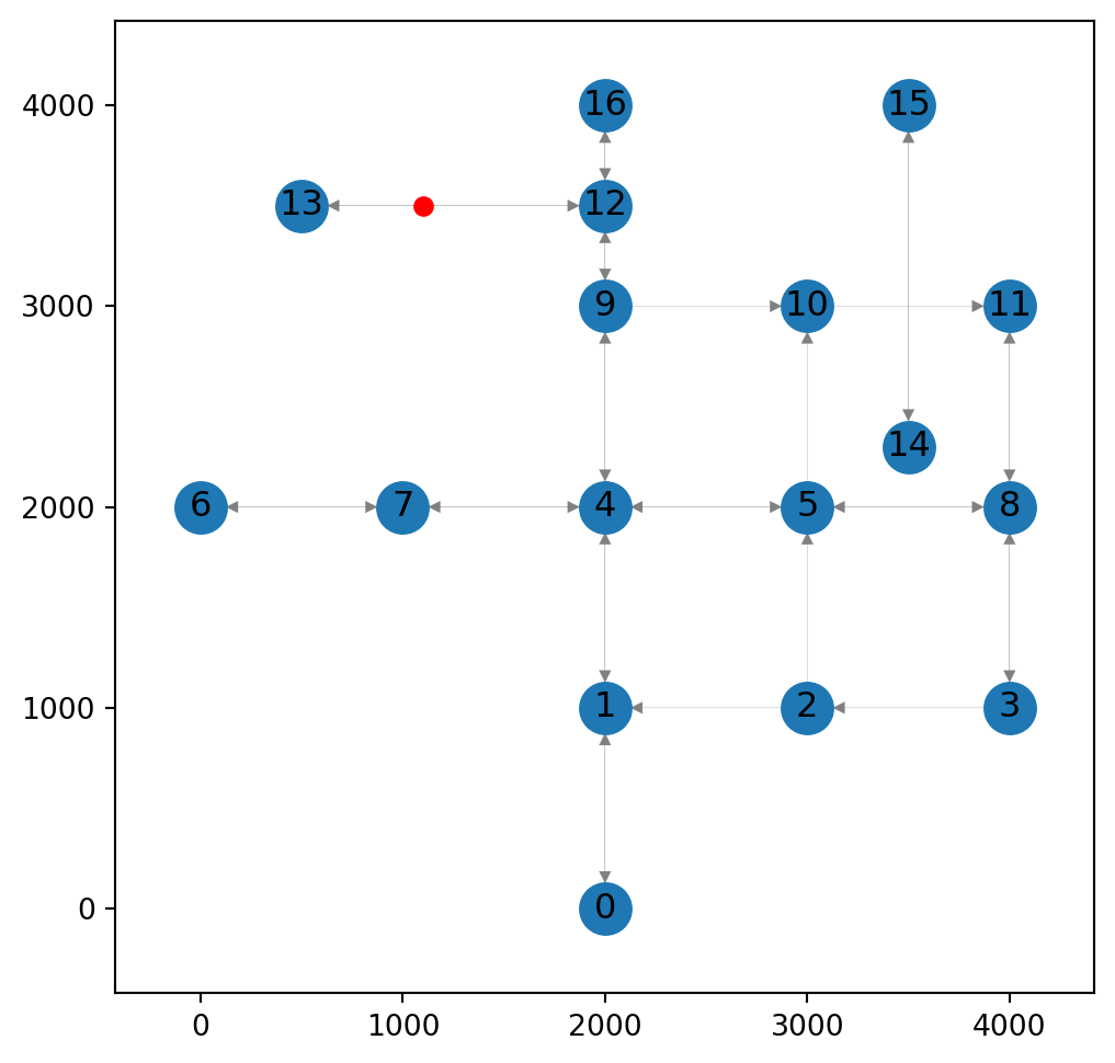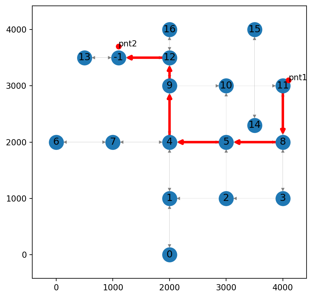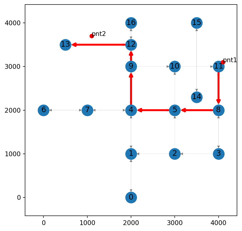 pnt2 = shapely.Point(1100, 3700)The function we define for routing while adding new nodes is called net2.route2. Here is its source code:
