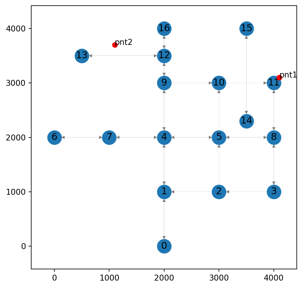 Here is how we can identify the nearest nodes to pnt1 and pnt2, using the net2.nearest_node function (Nearest node):