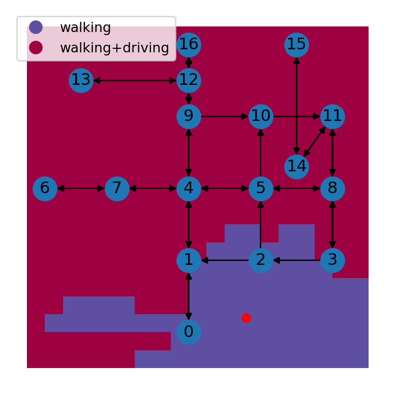| 4 | POLYGON ((-250 3250, 0 3250, 0 ... | walking+driving |